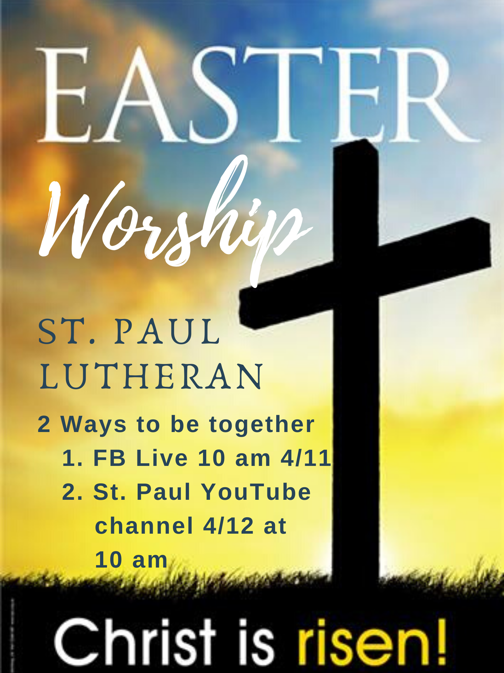 St. Paul worships together, both online and in person, at 10 am every Sunday. We welcome all to join us at 671 Clinton St. Defiance, Ohio or via livestream on Facebook and YouTube.