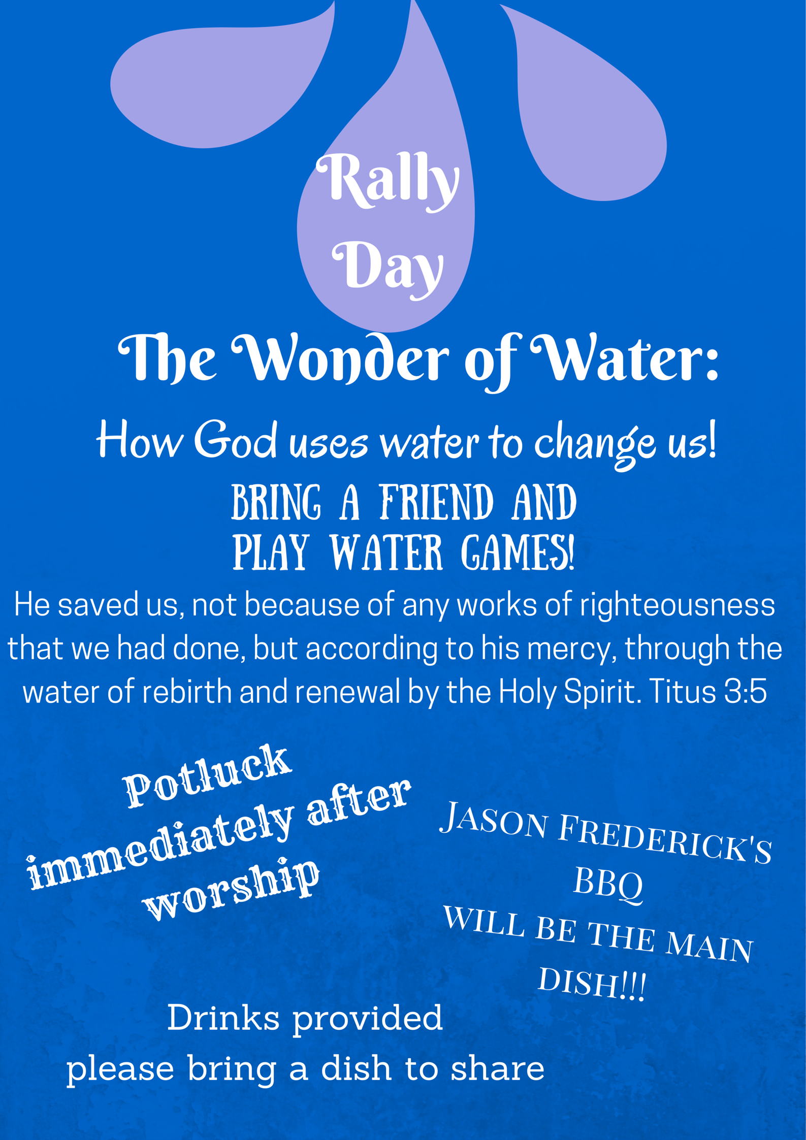 Rally Day Sunday!!! We return to Sunday School with a day of fun! New Bibles will be given out to 3 year olds and 3rd Graders! POTLUCK after worship!