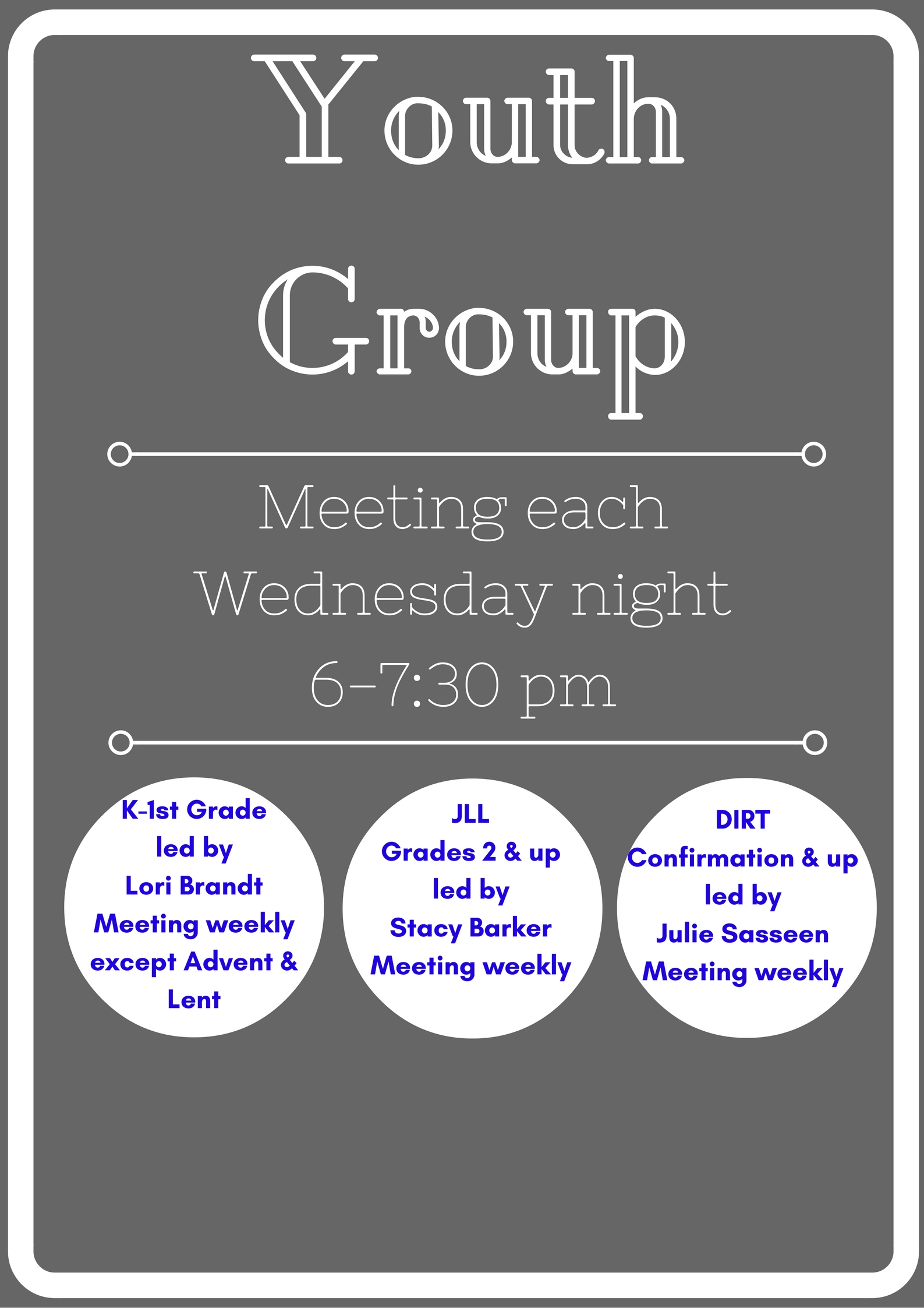 Our youth ministry takes place weekly between Labor Day and Memorial Day. We have groups for ages Kindergarten through High School meeting Wednesday, 6-7:30 p. We have Catechism classes also offered.